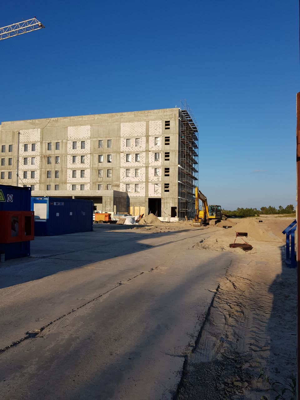 На данный момент уже полностью подготовлено свайное поле, возводятся монолитные конструкции технического подполья. К настоящему времени выполнено 50% от общего объема железобетонных работ.