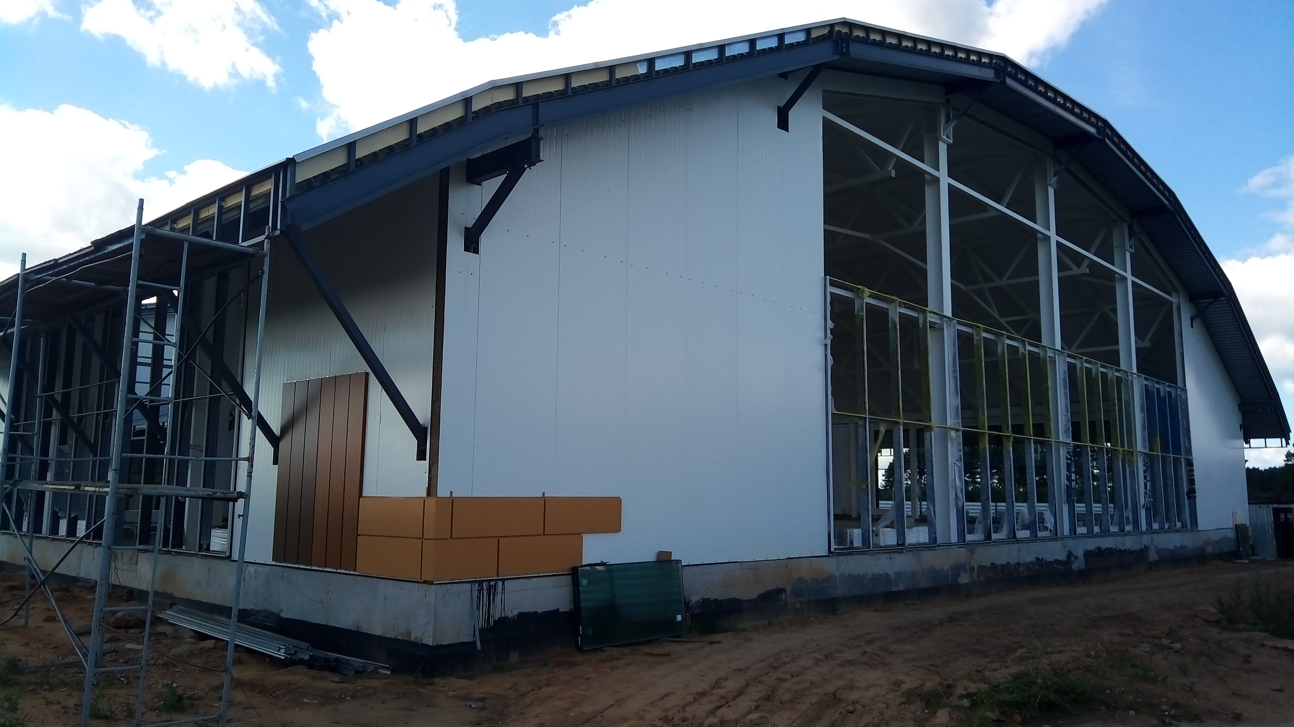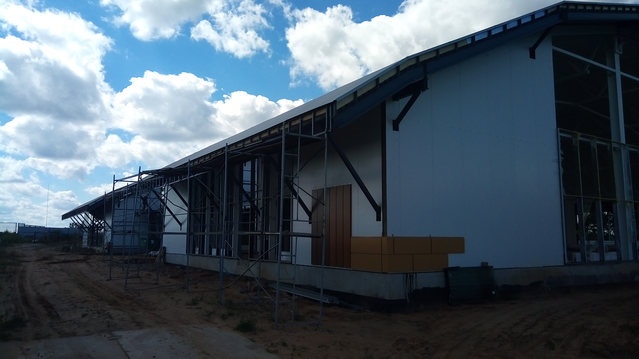 Ведутся работы по монтажу профлистов кровельного покрытия, устройству внутренних стен.